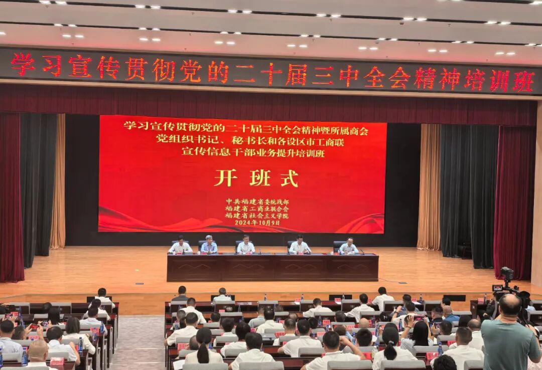 10月9日,省委统战部、省工商联学习宣传贯彻党的二十届三中全会精神暨所属商会党组织书记、秘书长和各设区市工商联宣传信息干部业务提升培训班开班式在省社会主义学院举办。省委统战部副部长、省工商联党组书记陈晞作开班动员,省委统战部部务会议成员、省社会主义学院党组书记章正样致辞,省社会主义学院副院长马建荣,省工商联党组成员、副主席余建出席开班式,省工商联党组成员、副主席叶善青主持开班式。省工商联所属商会党组织书记、秘书长和各设区市工商联宣传信息干部和省工商联机关干部以及民营企业家代表等200余人参加了开班式。